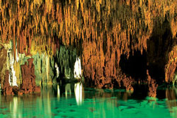 Aktun Chen Caves is 10 minutes south of Akumal in Tulum, Mexico. Aktun Chen Caves is located inside a 988 acre rainforest park. Three caves with a cenote, underground river, have been discovered in the park. The main cave is now suitable for touring. Enhanced with indirect lighting, thousands of stalactites, stalagmites and natural sculptures are visible.